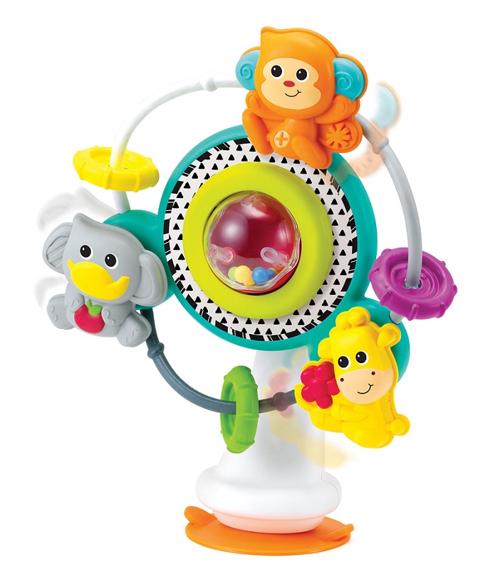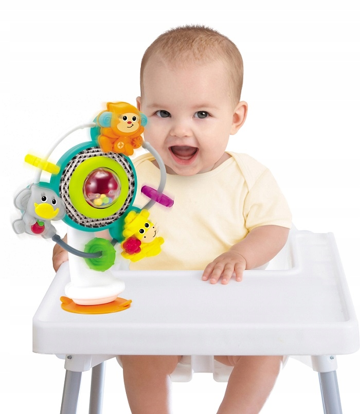 Żywe kolory i wzory zachęcą dziecko do chwytania, kręcenia i potrząsania. Zabawka wyposażona jest w przyssawkę umożliwiającą umocowanie na gładkim blacie – idealna przy posiłku.