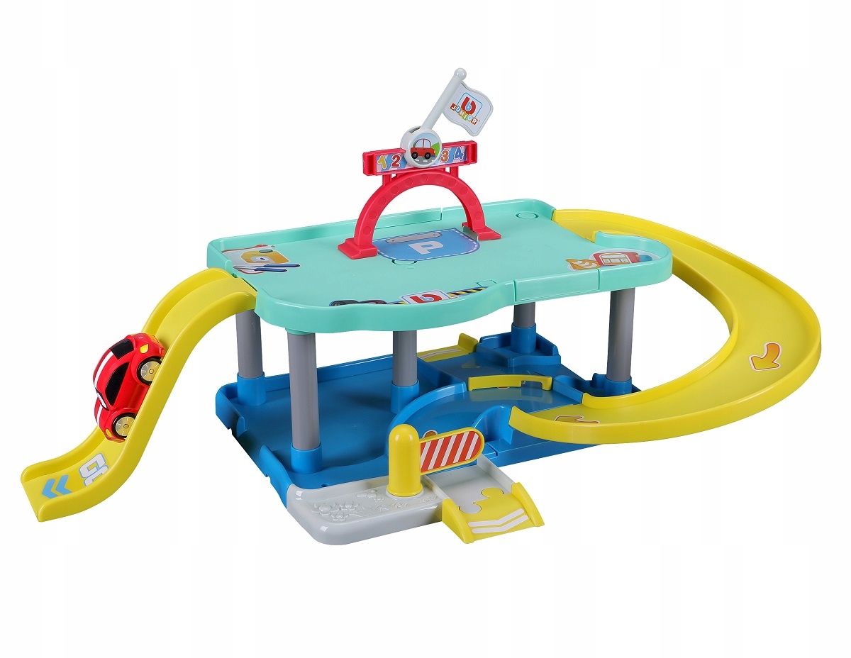 Garaż 2-poziomowy z parkingiem, rampami, bramkami, zjeżdżalnią i innymi akcesoriami. W zestawie autko Volkswagen Beetle 3,5”.