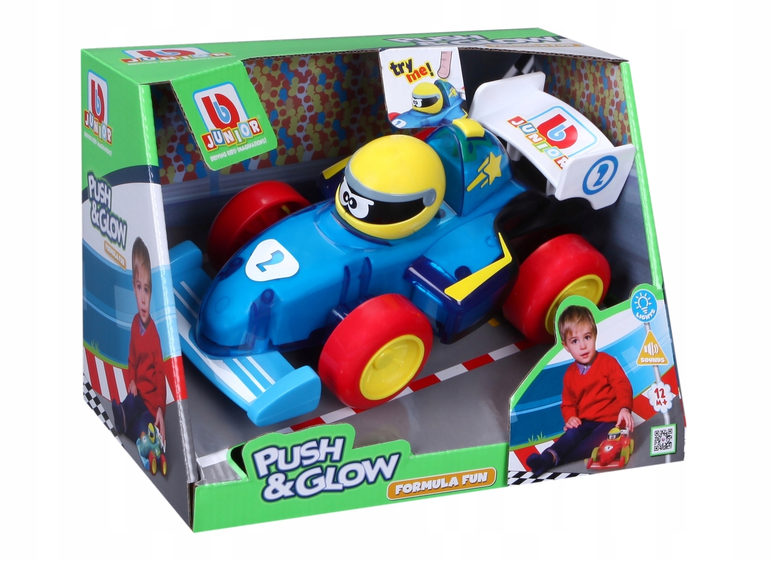 Autko z serii Bburago Junior ze światłami i efektami dźwiękowymi.