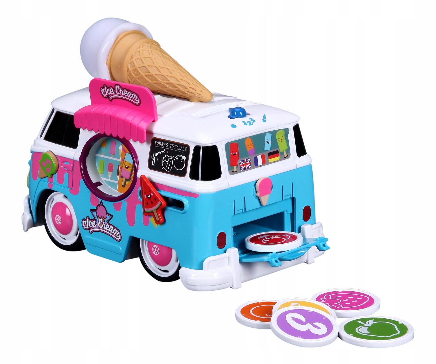 Włóż jedną z kolorowych monet do otworu na dachu i obserwuj jak zmieniają się kolory loda oraz wysłuchaj ich nazw w jednym z trzech języków (angielskim, francuskim i niemieckim)!