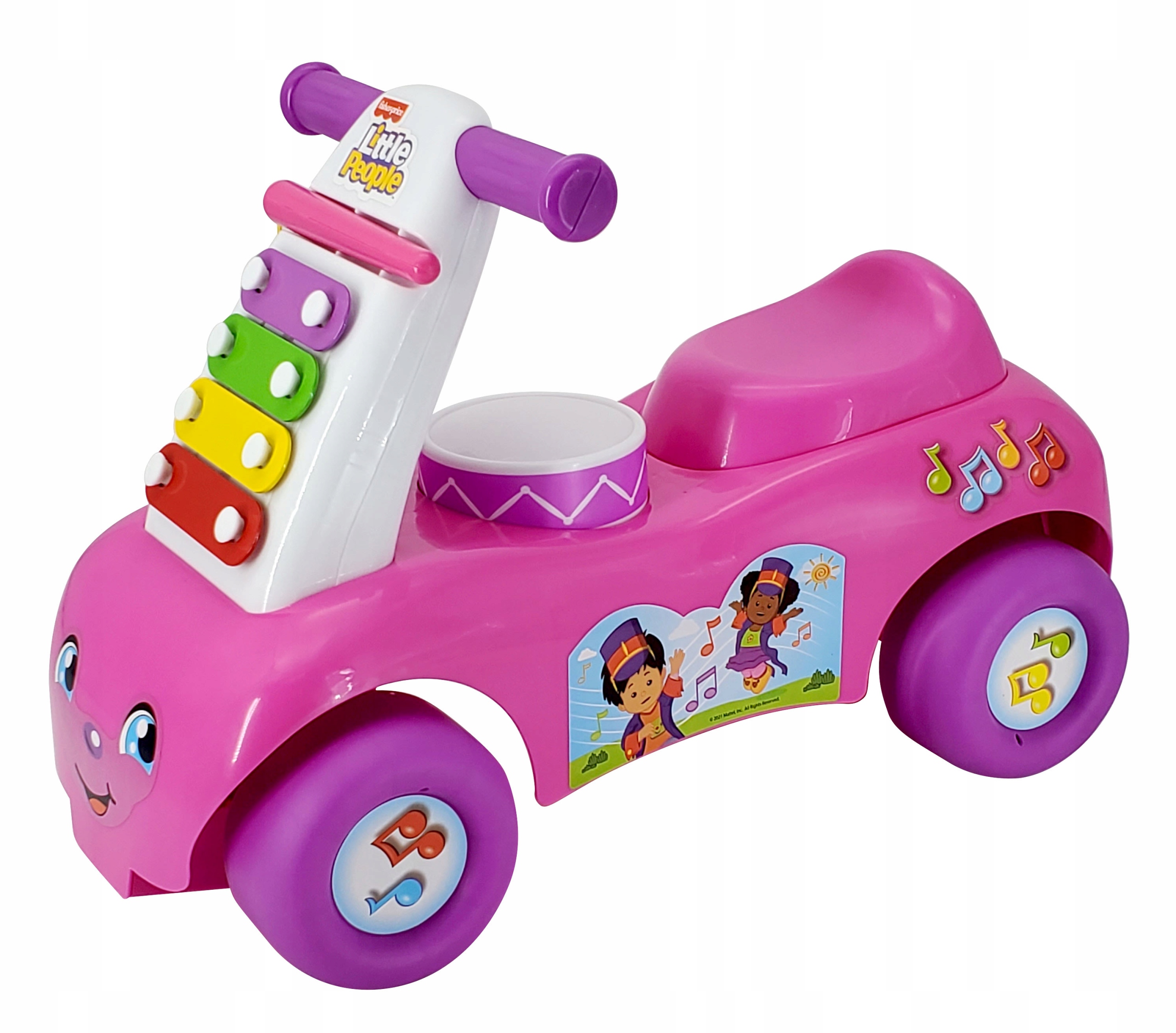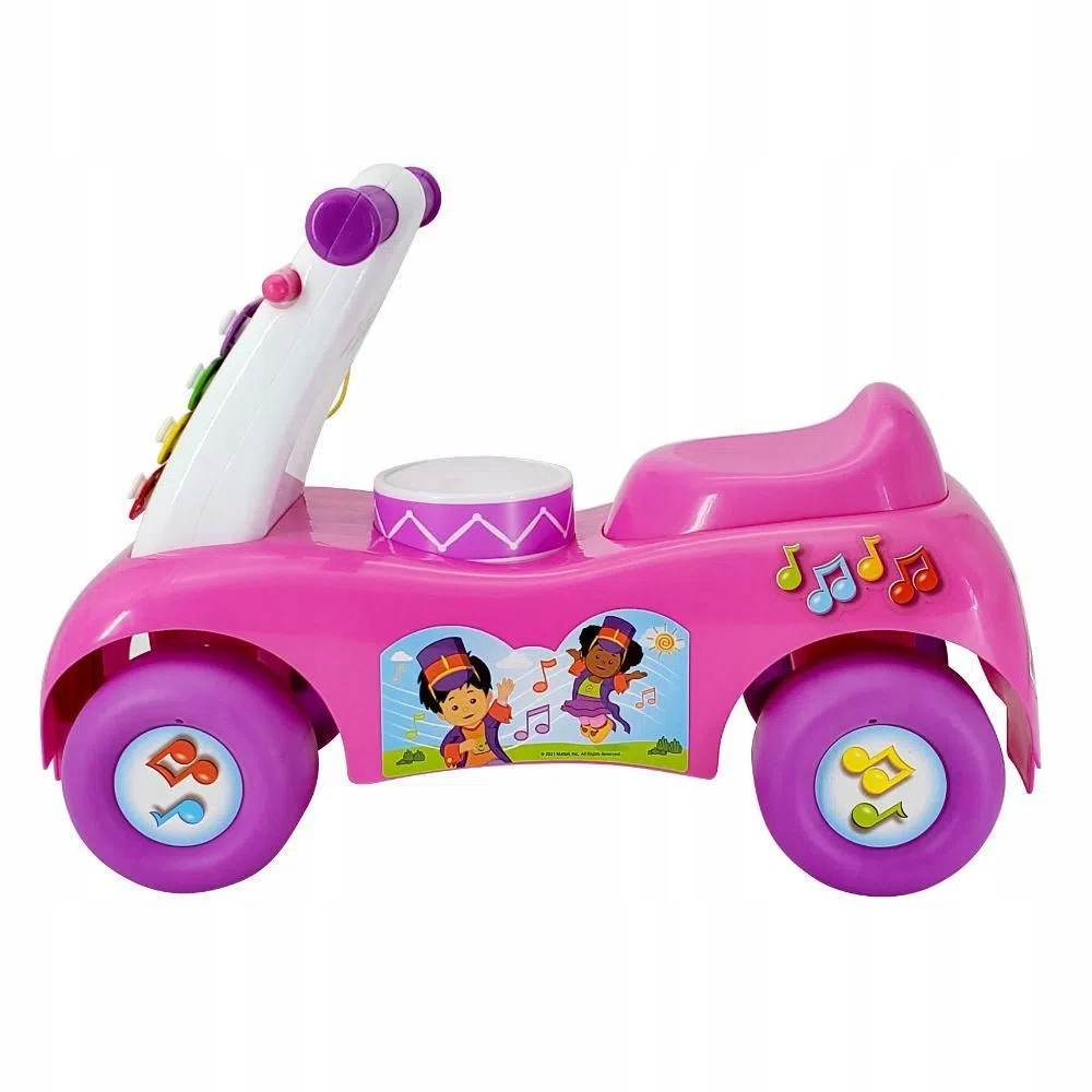 Pojazd zawiera cymbałki składające się z 4 kolorowych klawiszy umieszczonych na froncie jeździka oraz bębenek wbudowany przed siedziskiem. Na instrumentach można zagrać używając dołączonej pałeczki, którą można umieścić na froncie jeździka, po skończonej zabawie.