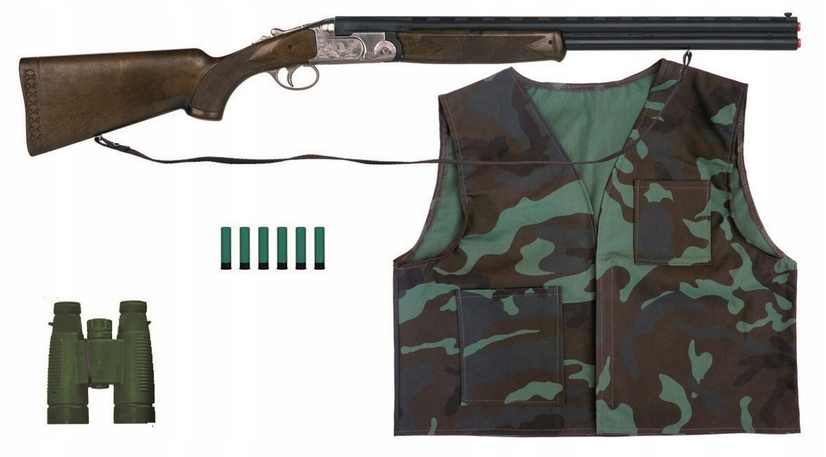 Zestaw zawiera: łamaną strzelbę myśliwską z paskiem na ramię ładowaną dwoma nabojami, kamizelkę w maskujących kolorach, zabawkową lornetkę i sześć naboi (łusek).