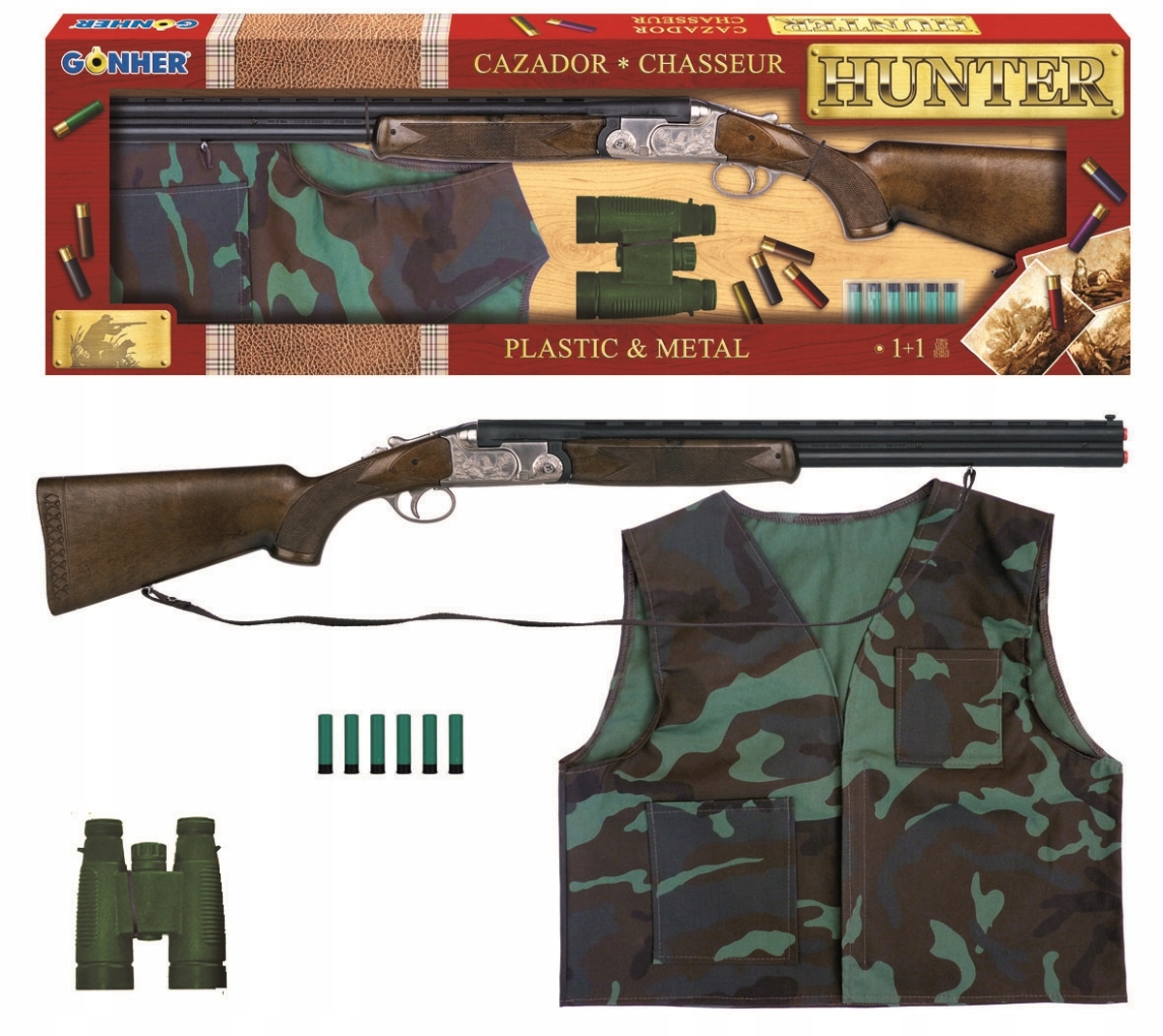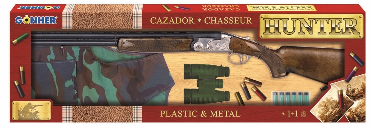 GONHER Zestaw myśliwski 3 w 1 – Dubeltówka (bok, nadlufka) + kamizelka + lornetka