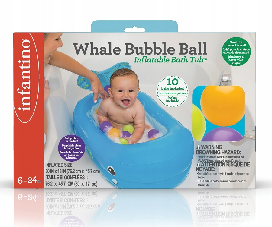 Dmuchany basenik w kształcie wieloryba będzie idealną zabawką na czas kąpieli. Wieloryb ma giętki, pobrzękujący ogon oraz 10 pływających kulek, które zapewnią dziecku rozrywkę.