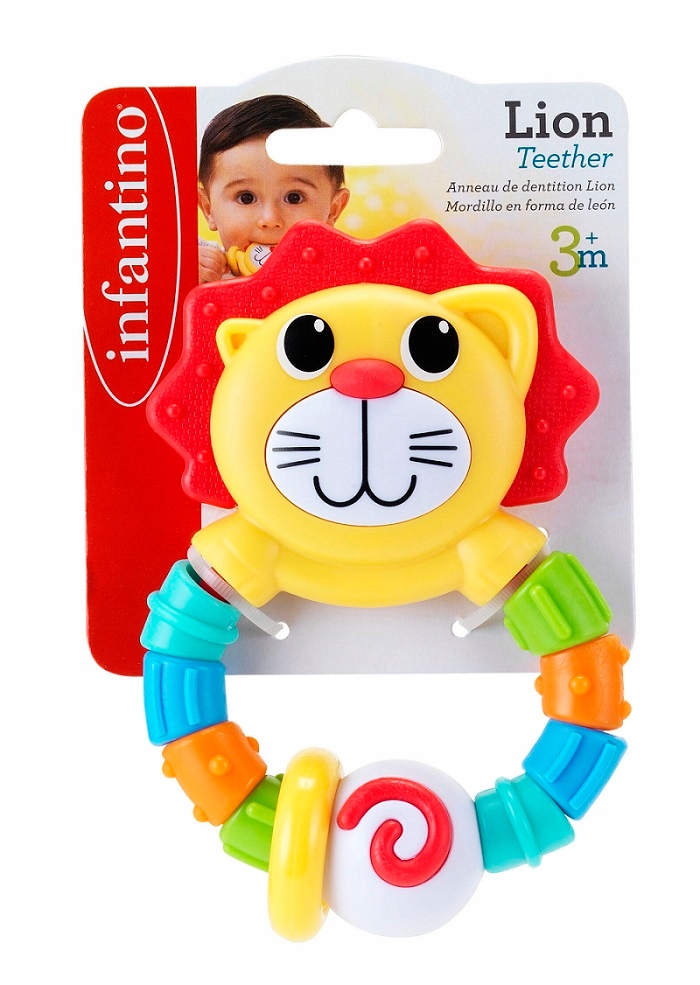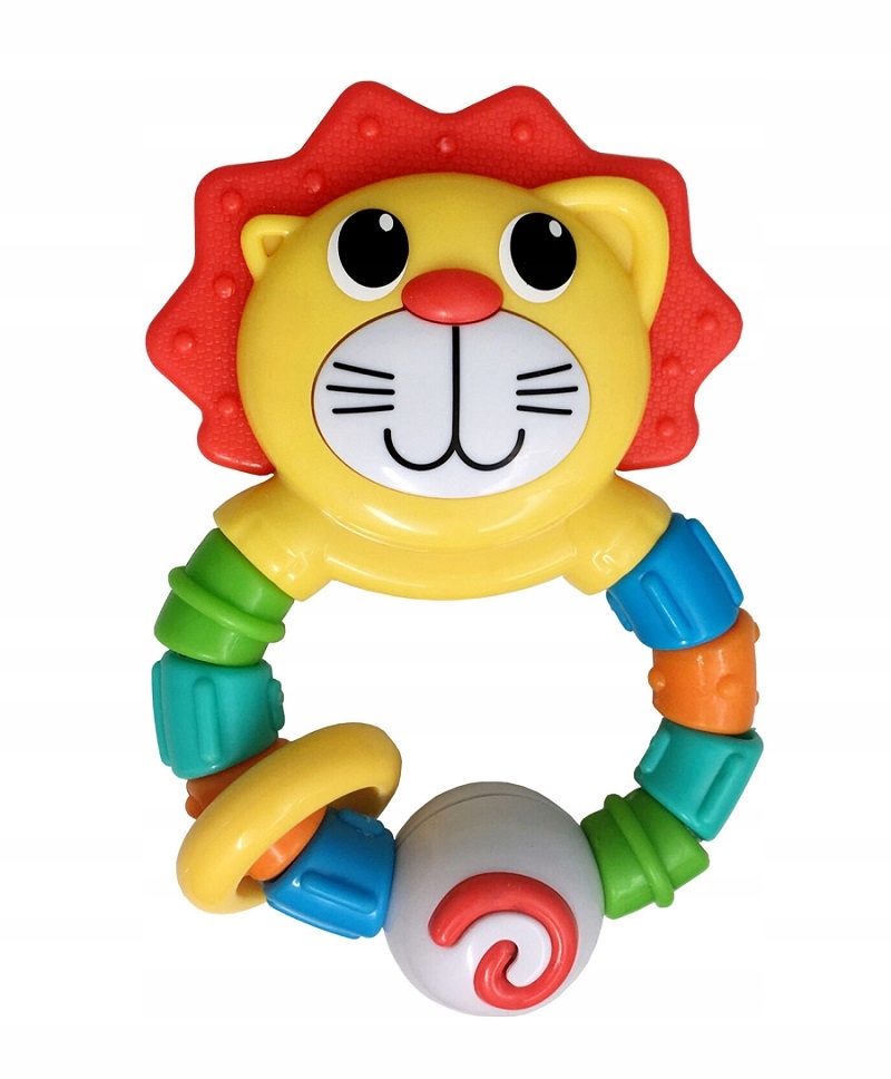 Ten giętki gryzaczek w kształcie lwa zawiera różne faktury do gryzienia. Na giętkim krążku znajdują się koraliki o różnych fakturach i kolorach, które można dowolnie okręcać. Grzywa lwa to gryzaczek z wypustkami, który ukoi podrażnione dziąsła.