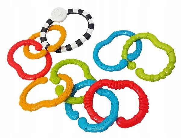 Kolorowe kółka łączą się ze sobą we wzorzysty łańcuch. Każdy element posiada wyjątkową fakturę stymulującą zmysł dotyku. Zabawka zapewnia kreatywną zabawę. Każde kółko może być również gryzaczkiem.