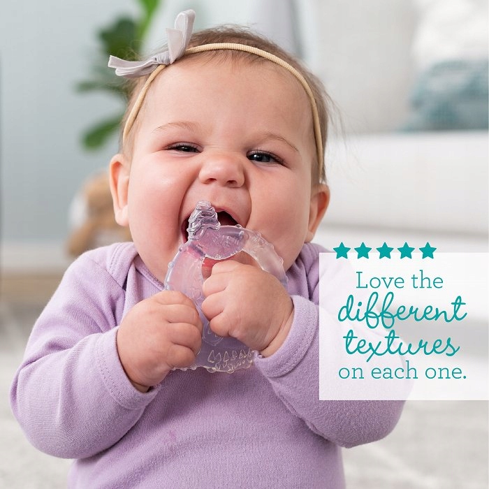 Zestaw gryzaków Crystal Clear bez BPA, barwników i ftalanów, pełen tekstur i kształtów potrzebnych do spełnienia wszystkich etapów ząbkowania.