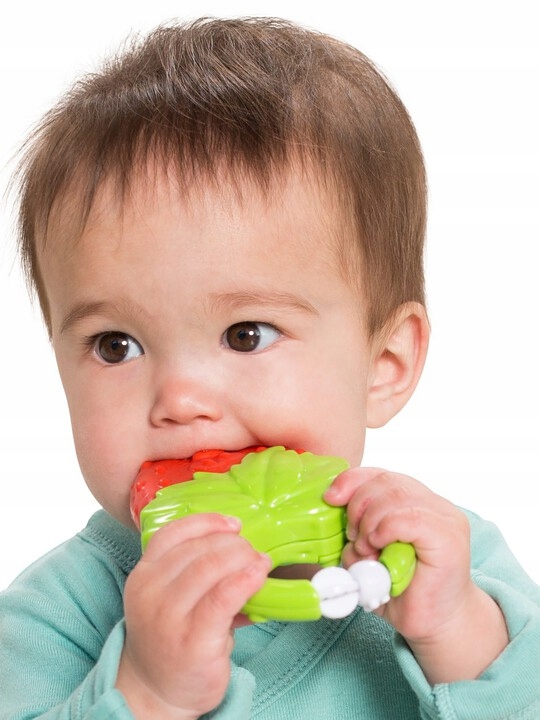 Gryzak w kształcie truskawki. Po naciśnięciu miękkiej części, gryzaczek delikatnie wibruje masując podrażnione ząbkowaniem dziąsła dziecka.