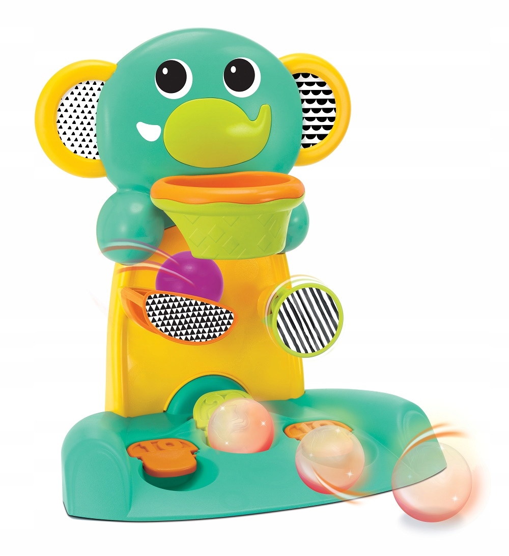 Maluchy mogą wrzucać świecącą i mrugającą piłeczkę do kosza, a następnie oglądać jak obracają się kolorowe elementy i zbierać punkty.