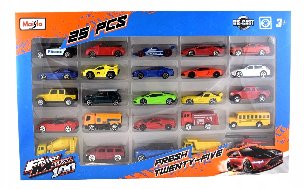W zestawie 25 różnych modeli pojazdów, w tym m.in. Dodge Viper, Mini Cooper, Lamborghini Aventador, Lamborghini Countach.
