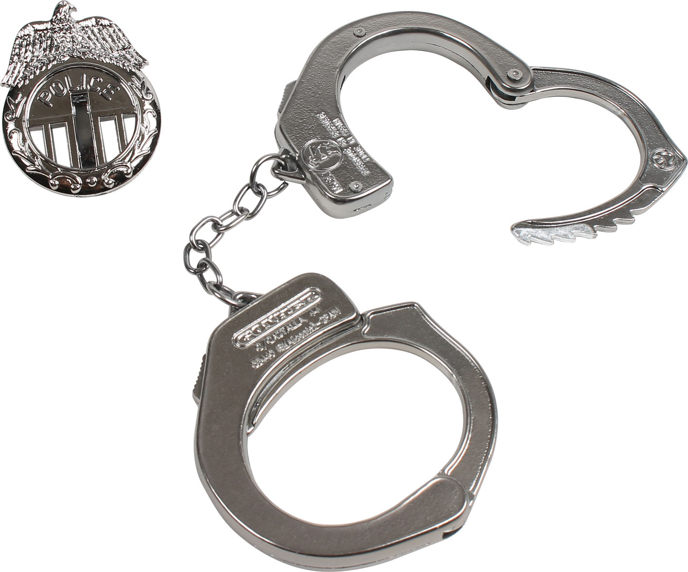 Metalowa odznaka policyjna i kajdanki marki Gonher.